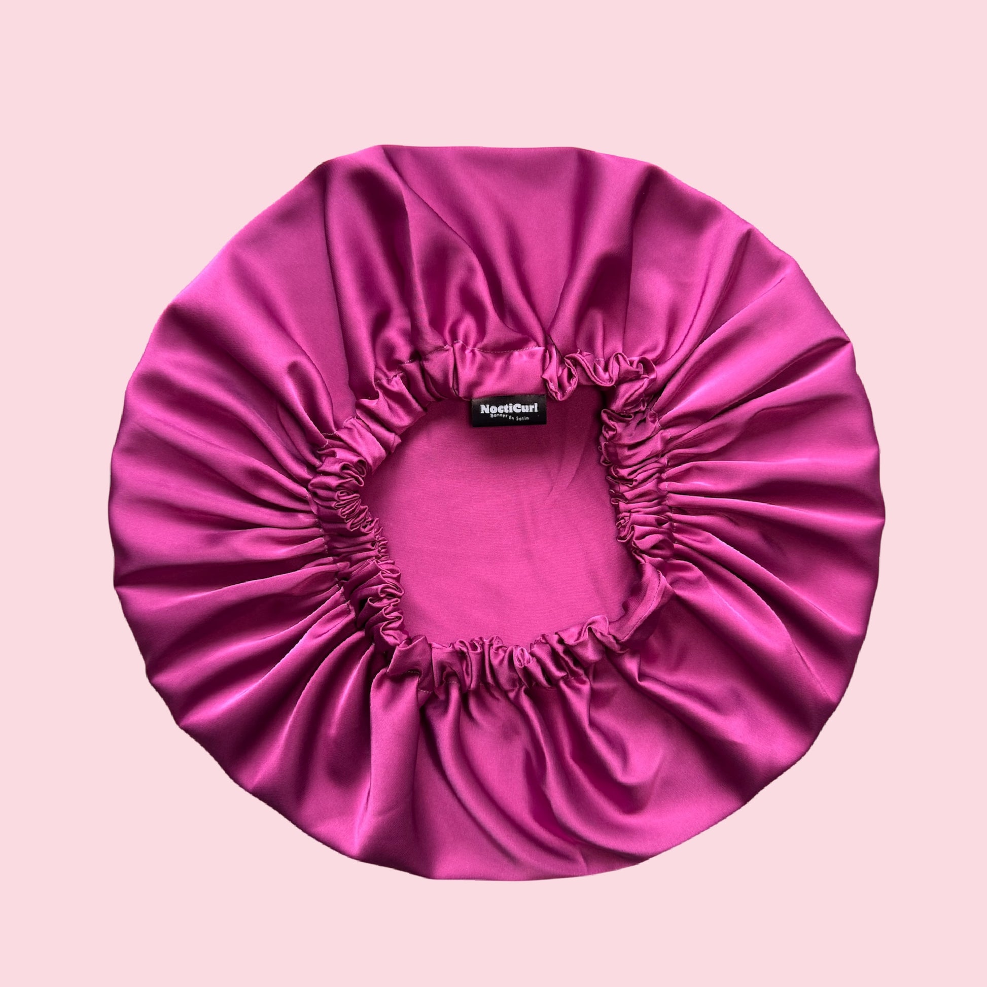 Bonnet en satin magenta anti-frisottis, idéal pour protéger les cheveux pendant la nuit. Doux, léger et non glissant, il aide à conserver l’hydratation, réduire la casse et dompter les frisottis. Parfait pour tous types de cheveux.