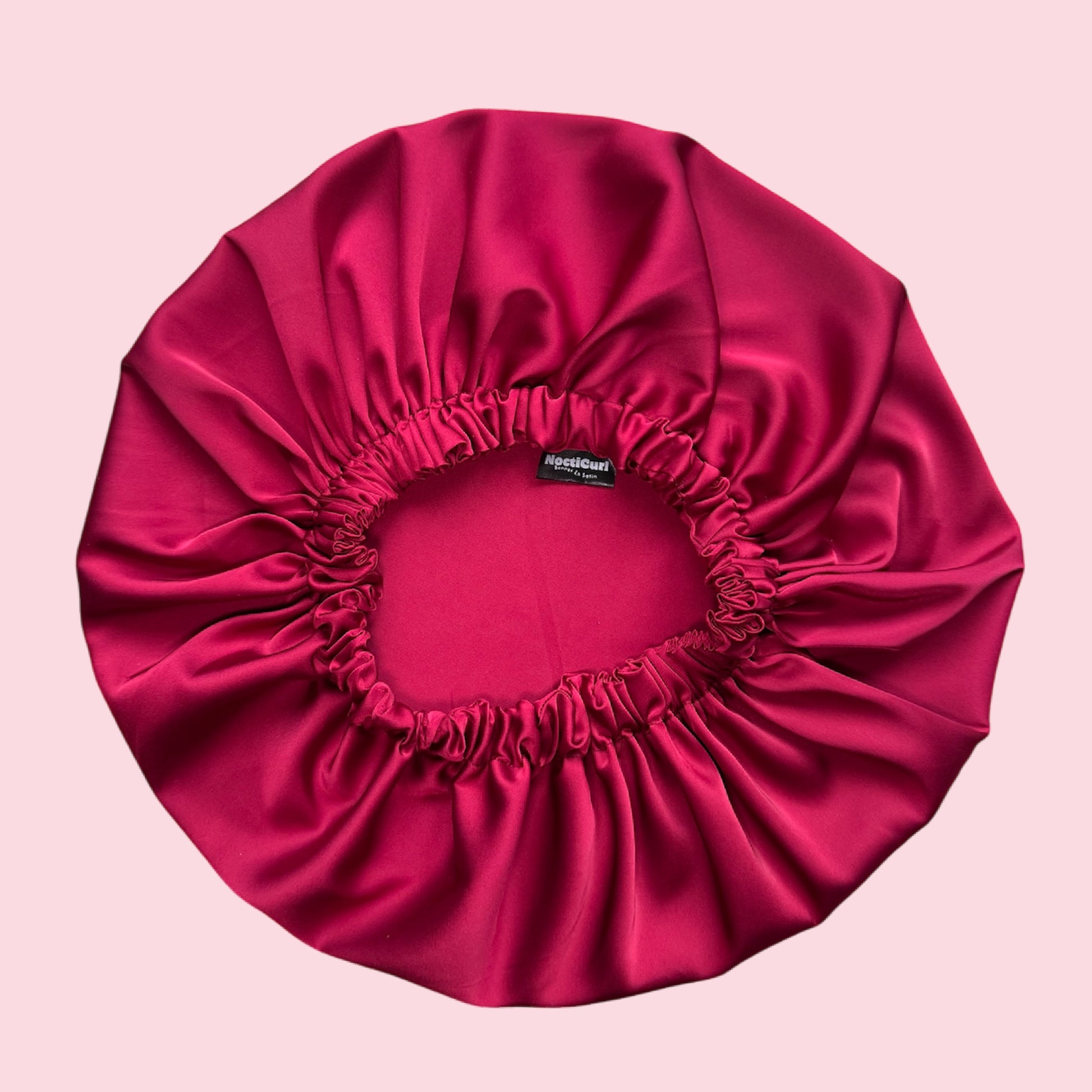 Bonnet en satin bordeaux anti-frisottis, idéal pour protéger les cheveux pendant la nuit. Doux, léger et non glissant, il aide à conserver l’hydratation, réduire la casse et dompter les frisottis. Parfait pour tous types de cheveux.